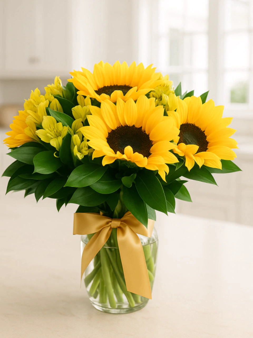 Por que escolher o Arranjo Sunshine? - Girassóis Radiantes: Esses não são apenas girassóis; eles são como pequenos sóis que vão brilhar na casa de quem você ama! - Folhagem Elegante: Acompanhados por folhagens que dão aquele toque de sofisticação, porque quem disse que só os girassóis podem brilhar? - em Vaso de Vidro