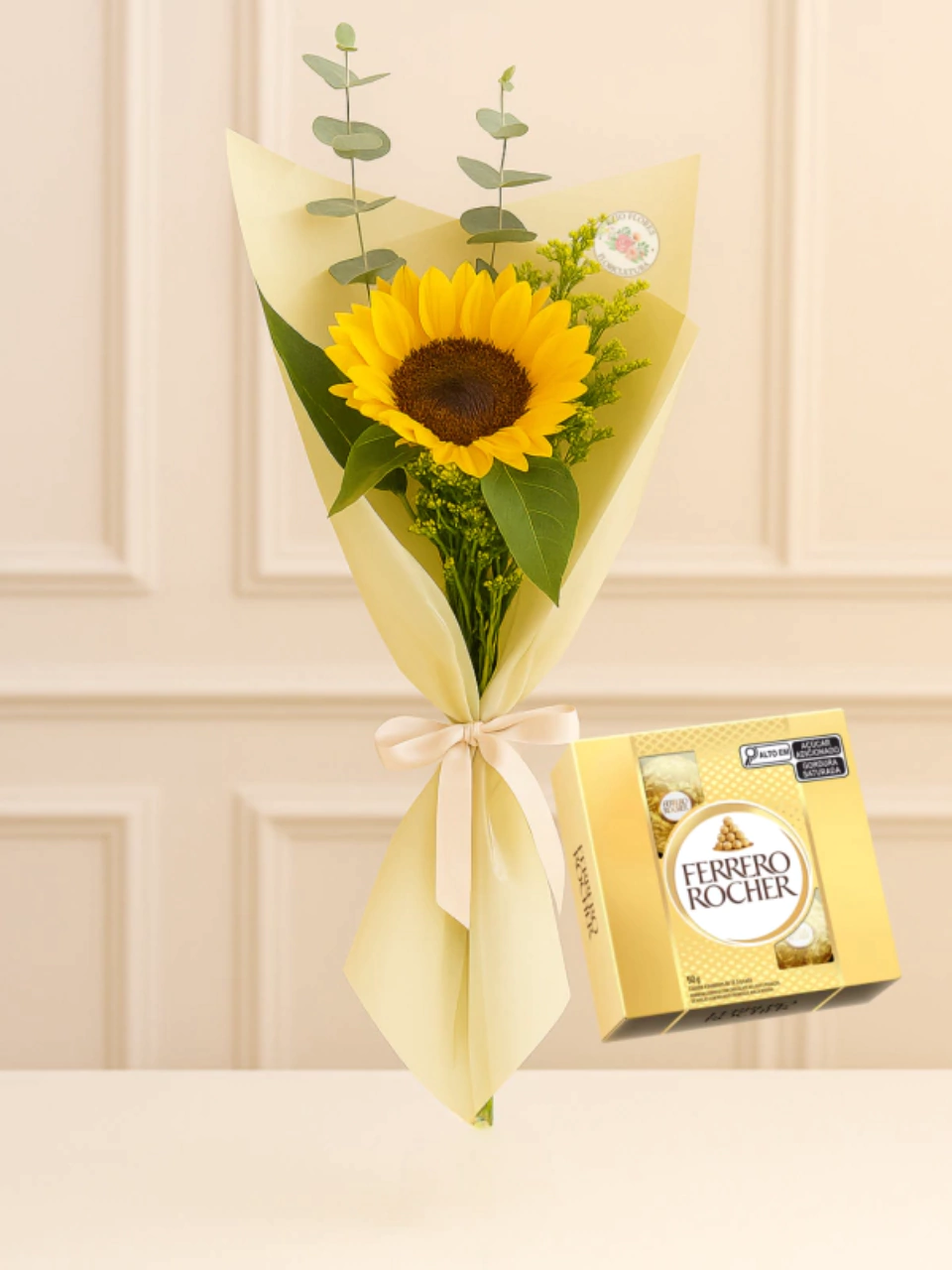 Destaques do Produto: - Girassol Fresco: Selecionado com carinho para garantir exuberância e durabilidade. - Acompanhado de Ferrero: Para adoçar ainda mais o momento, o buquê vem com um delicioso Ferrero com 4 unidades. - Perfeito para Todas as Ocasiões: Seja para um aniversário, um agradecimento ou apenas para dizer "eu te amo".